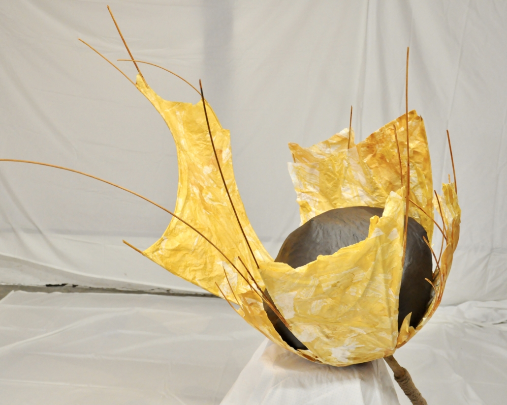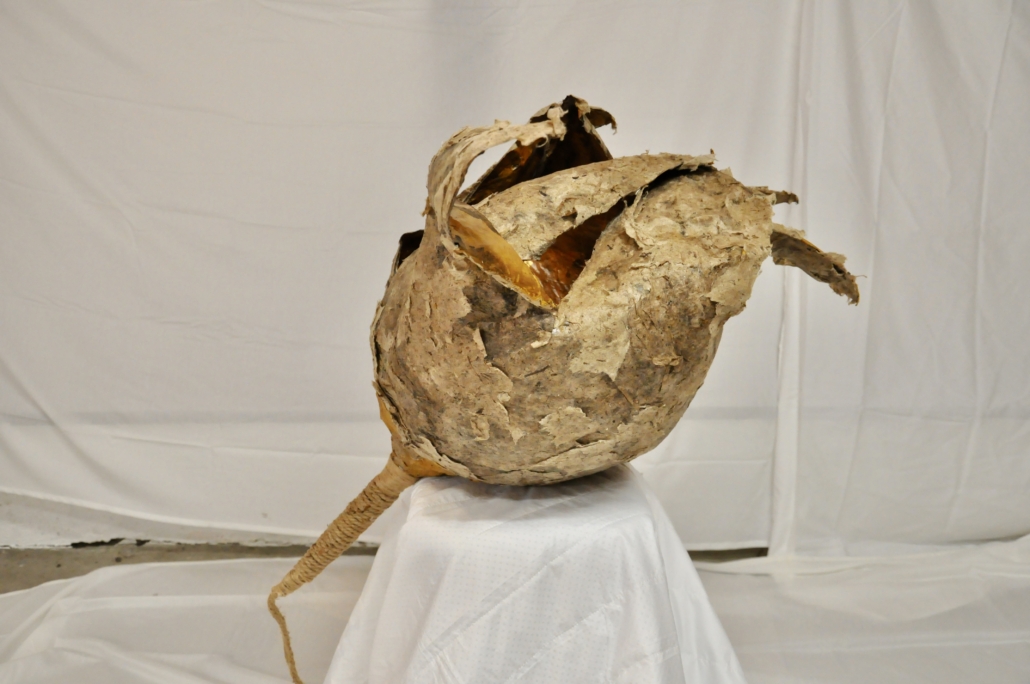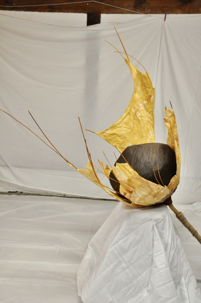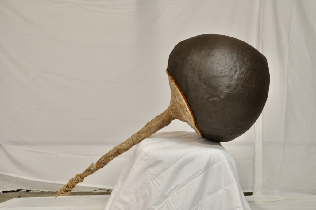 "Seed" sculpture in papier mache, paper from mulberry tree, hemp, wood and acrylic. L: 92 cm, w: 37 cm.