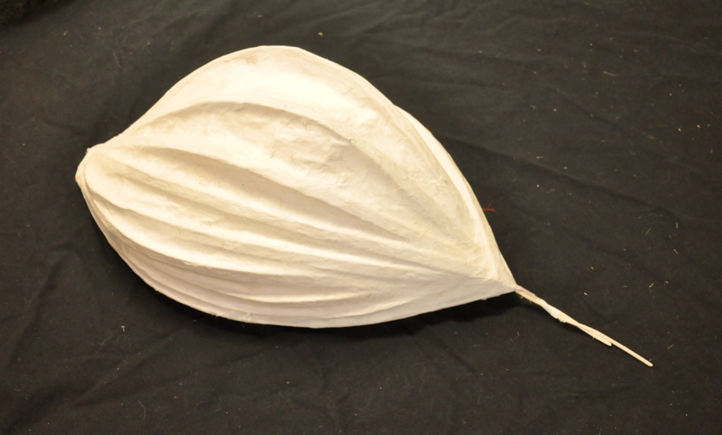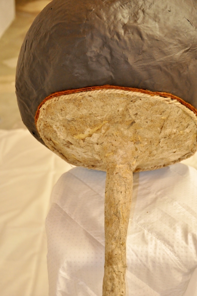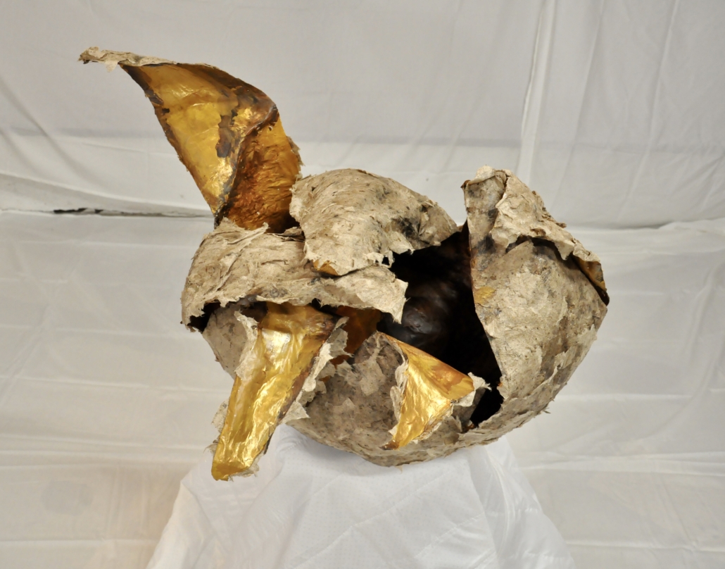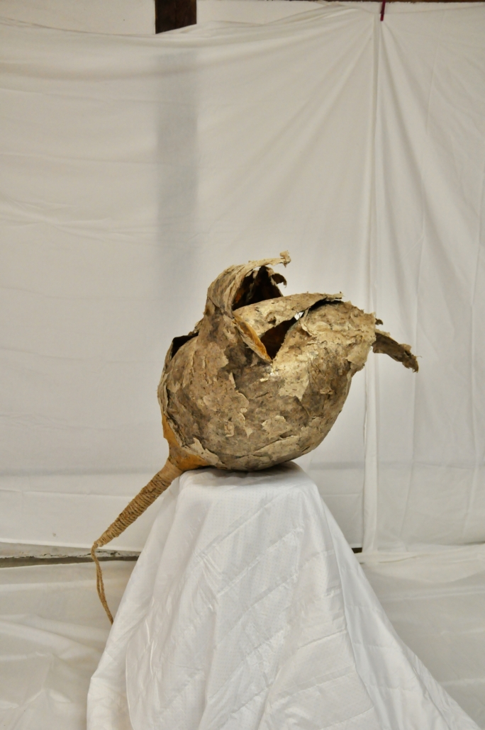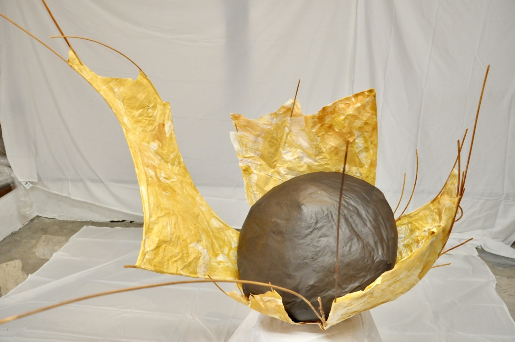 "Seed" sculpture in papier mache, paper from mulberry tree, hemp, wood and acrylic. L: 92 cm, w: 37 cm.