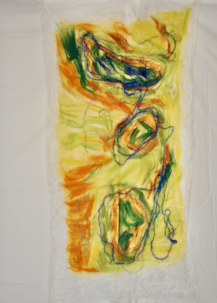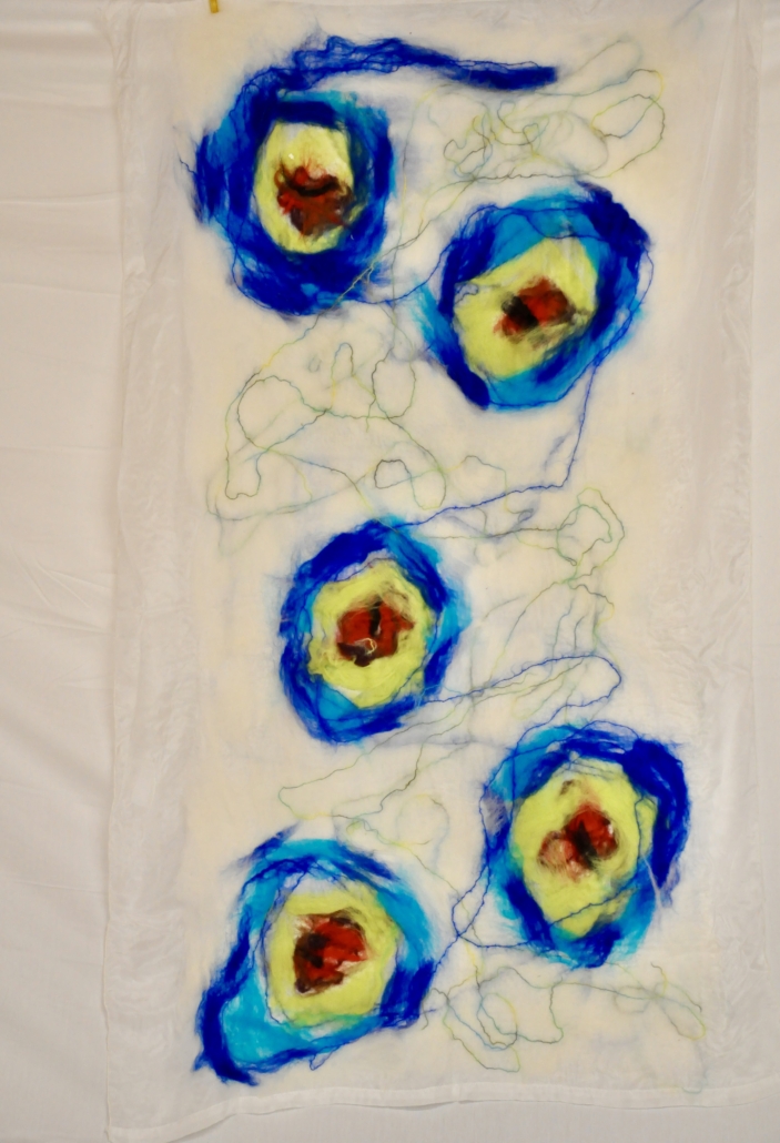 "Dancing cells" hanging wet felted wool on silk. L: 158 cm, w: 78 cm.