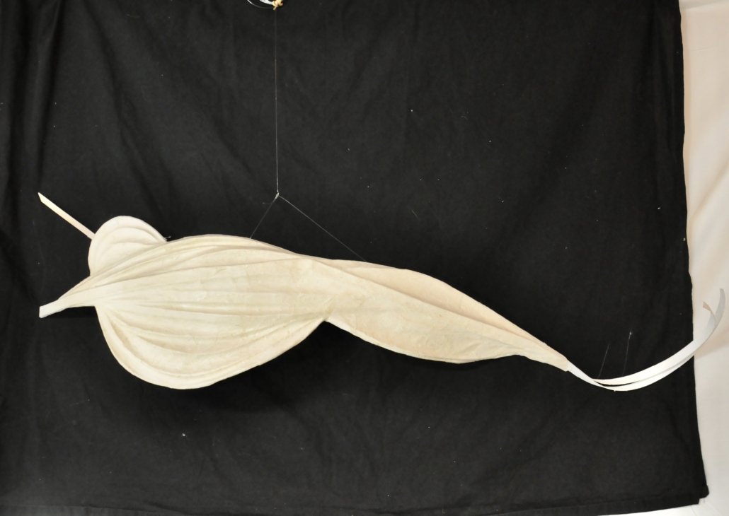 "Bird" sculpture of rice paper and rattan. L: 123 cm, w: 30 cm, d: 15 cm.