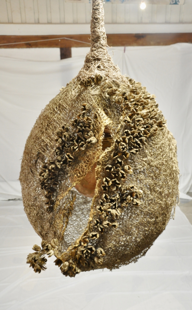 "Hanging sees" hanging sculpture made of hemp, acrylic and acorn. L: