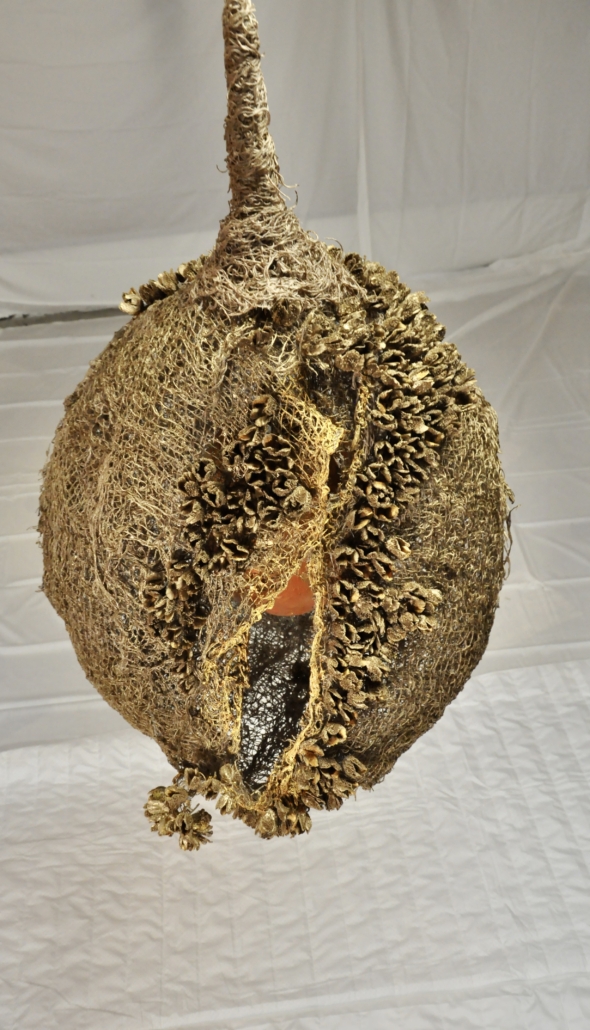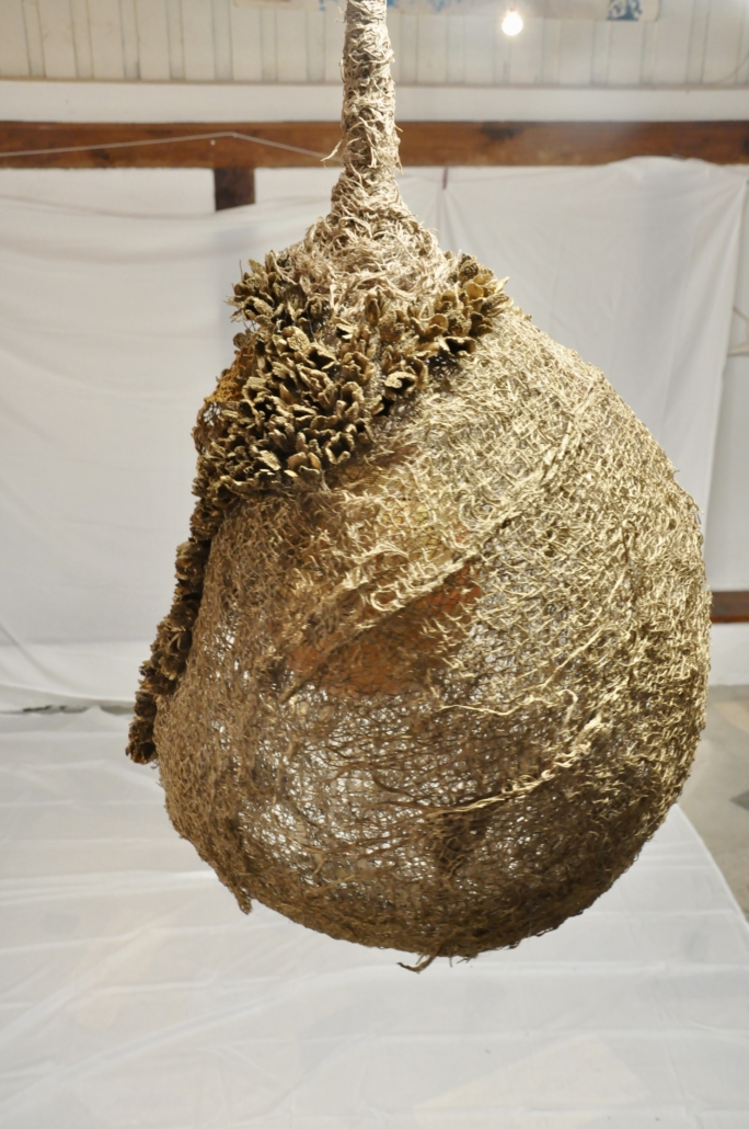 "Seed" sculpture in papier mache, ricepaper, rattan, wood and hemp- L: 200 cm, w: 117 cm.