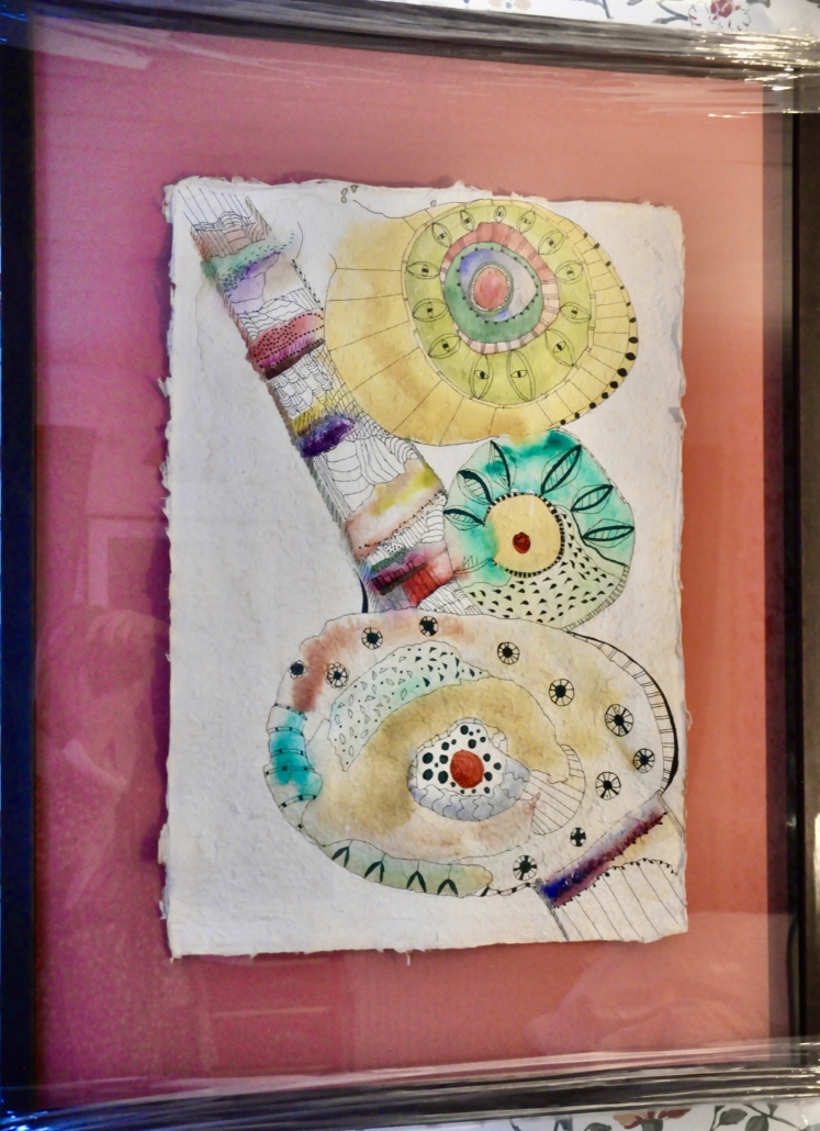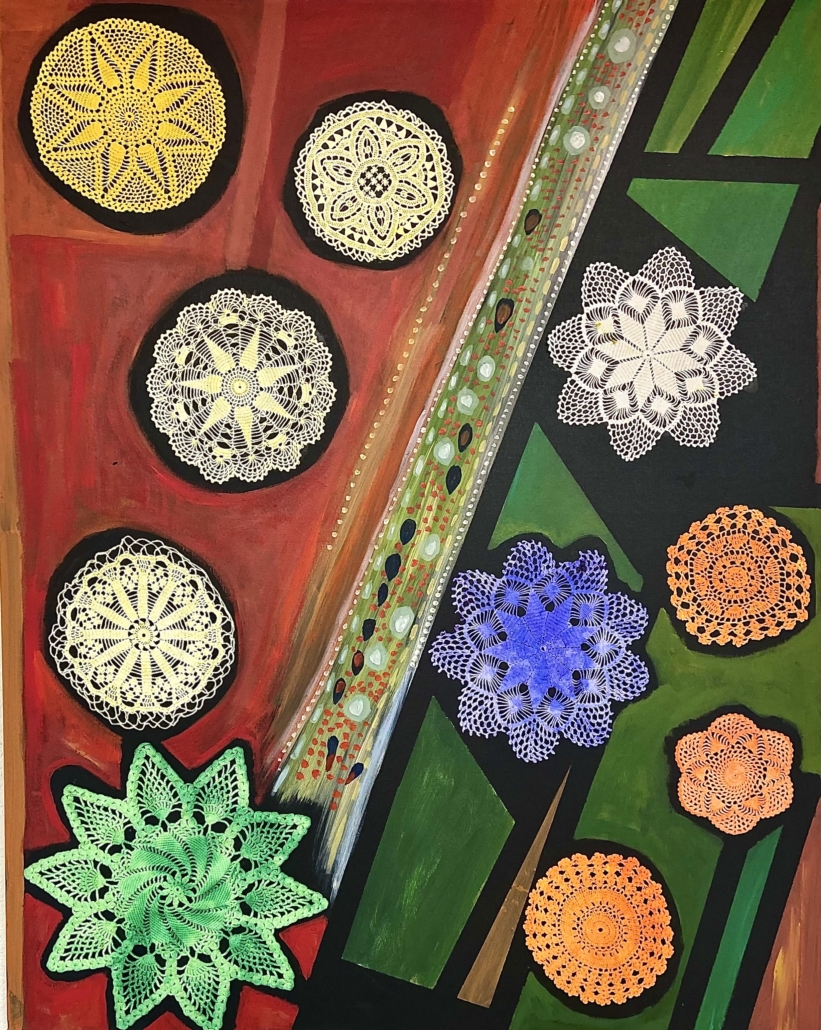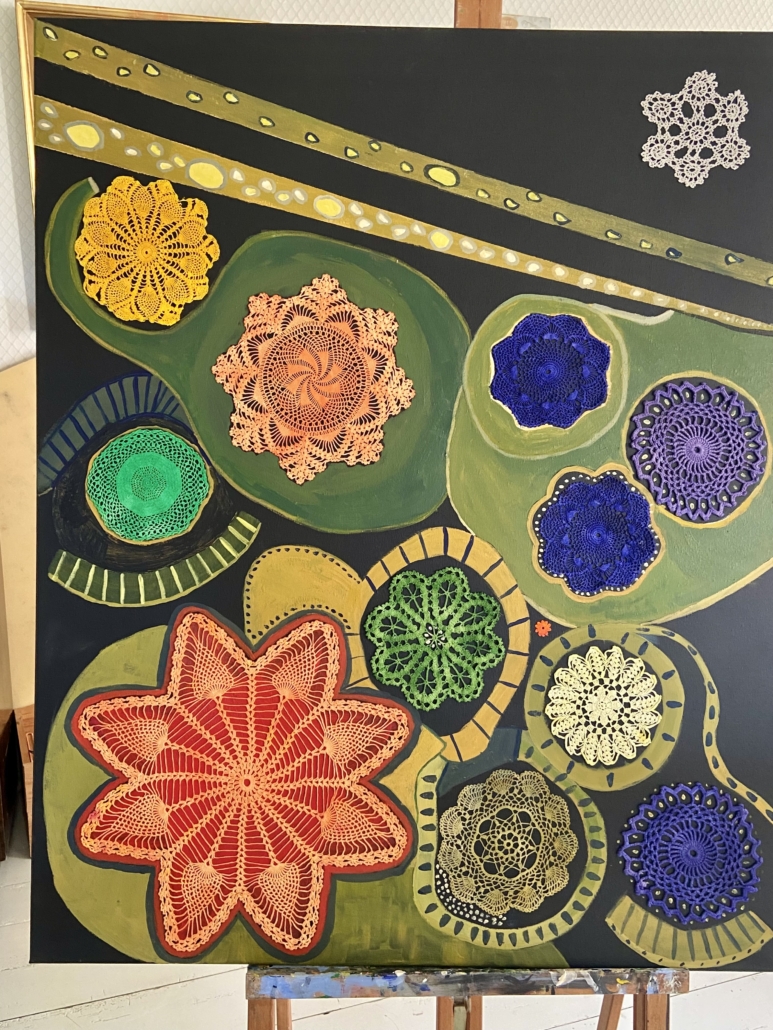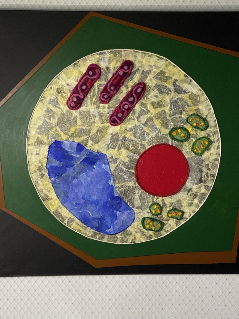 "Plant cell" acrylic, rice paper and filted wool on canvas. L: 100 cm, w: 100 cm.