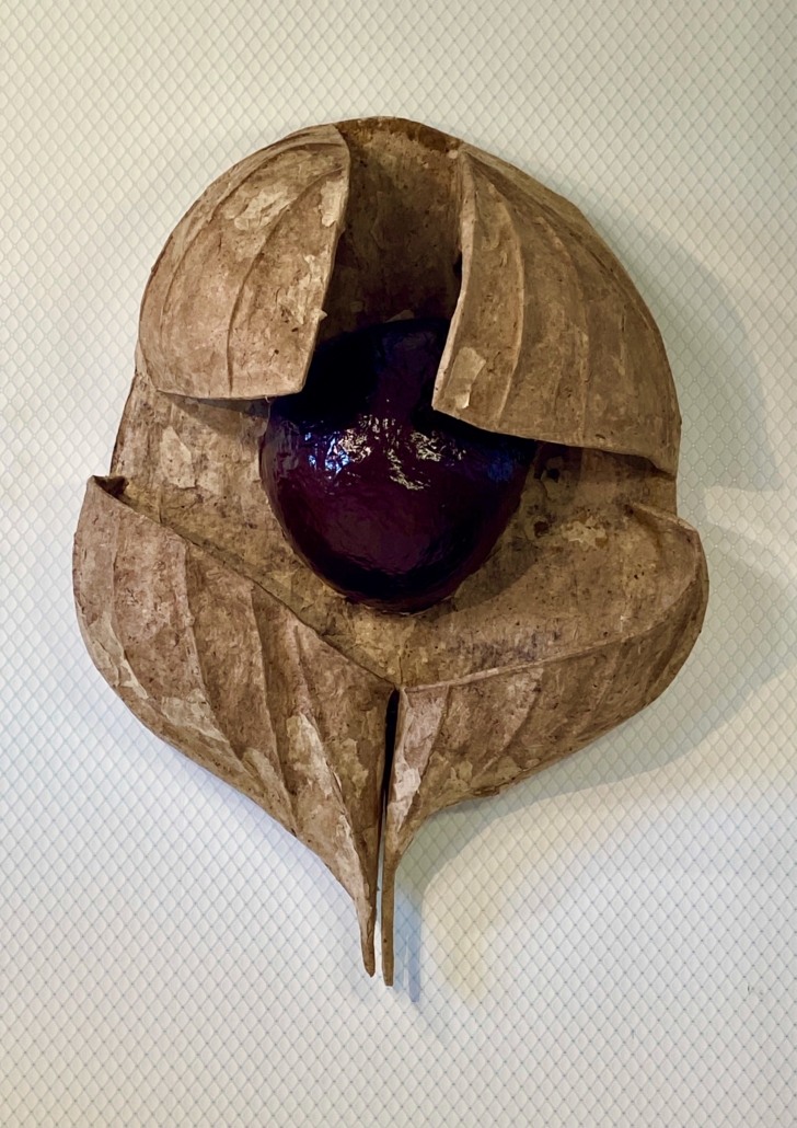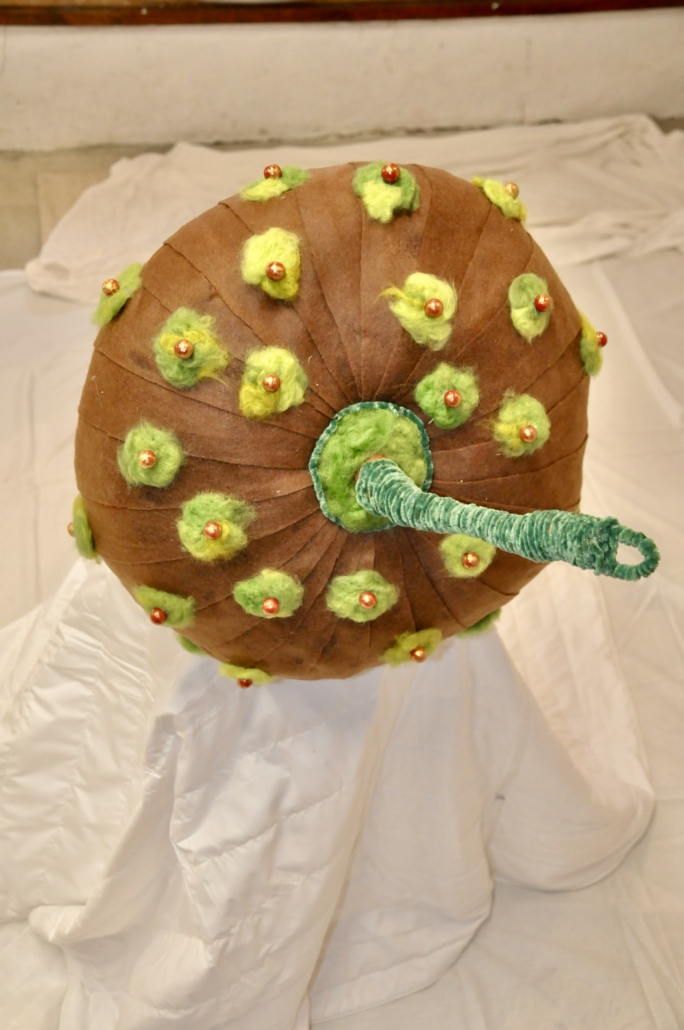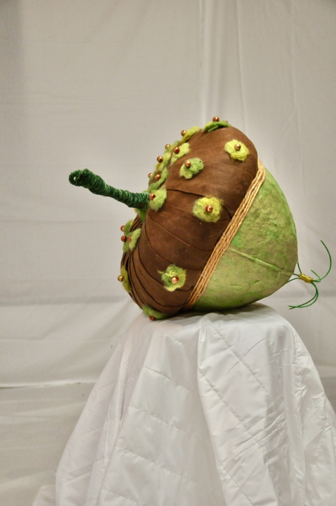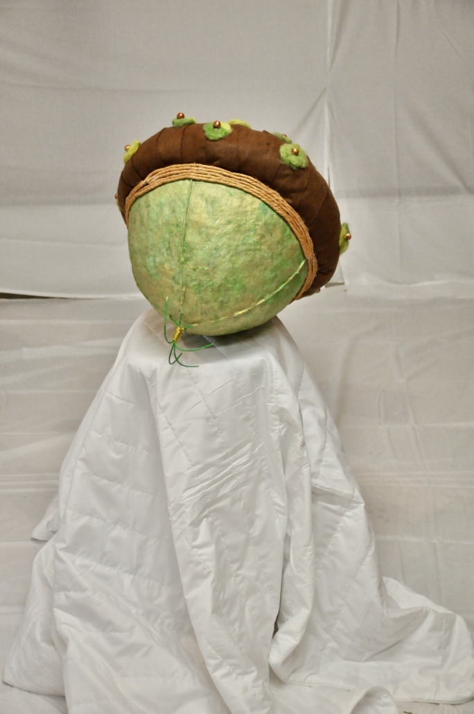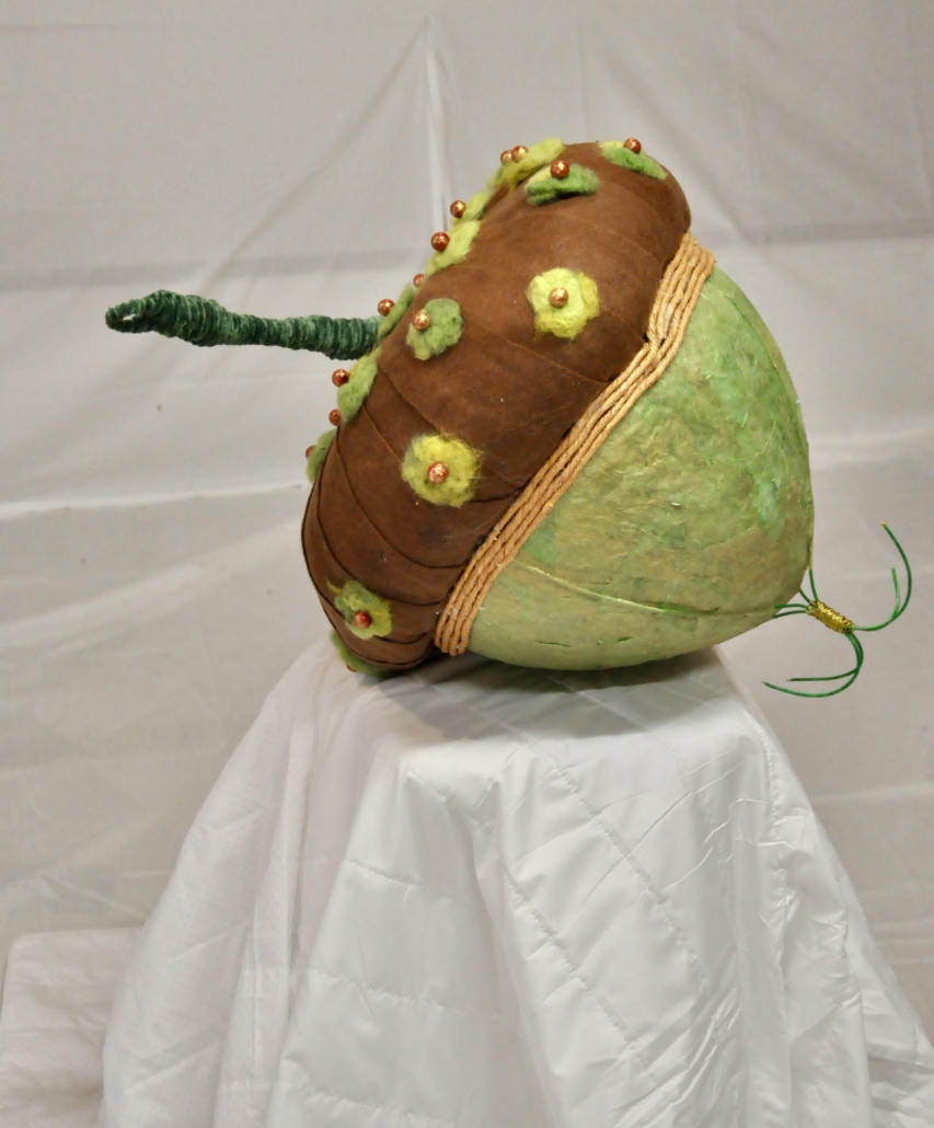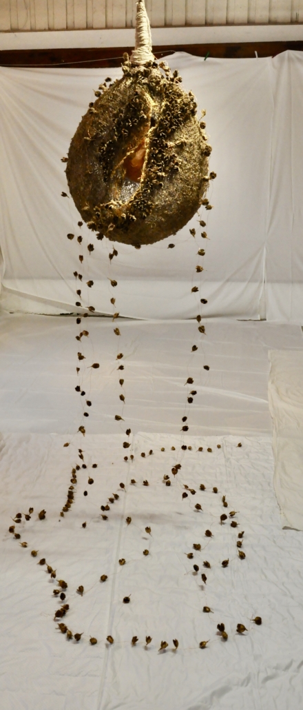 "Acorn" sculpture made of paper cache, rice paper, felted wool, golden hemp and pearls. L: 83 cm, w: 48 cm.