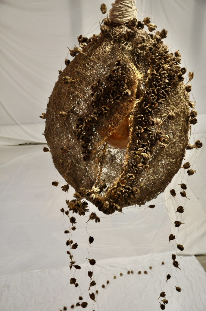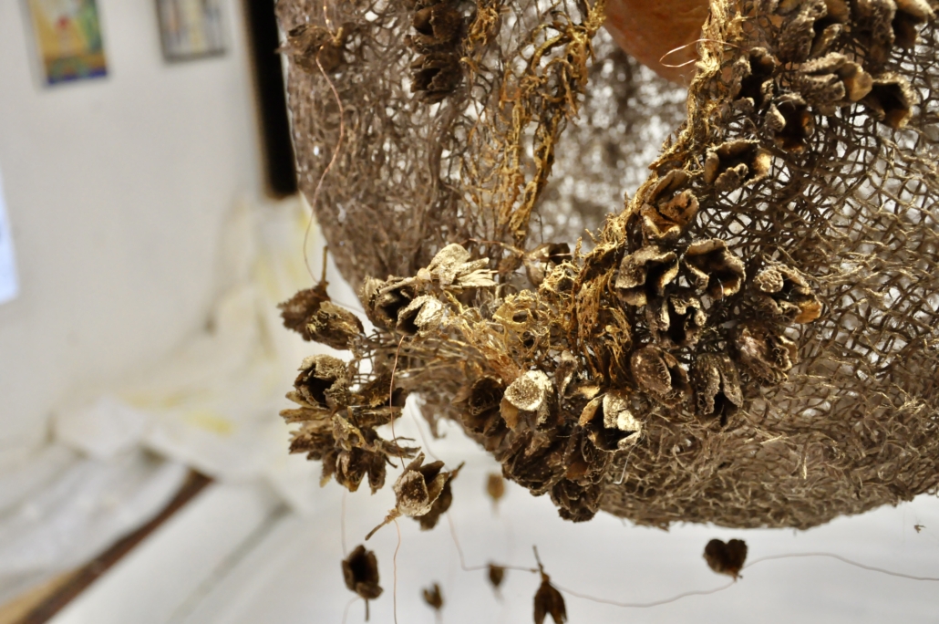 "Abundance" installation with hanging sculpture made of hemp, acrylic, beechnut and metal thread. L: 103 cm,, w: 52 cm.