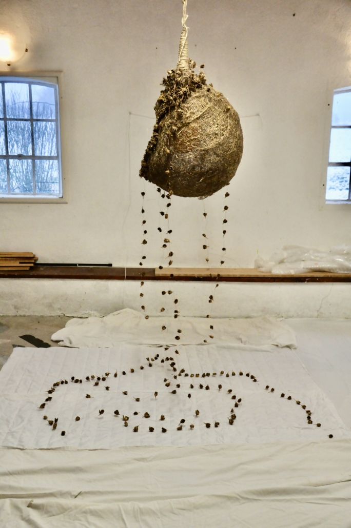 "Abundance" installation with hanging sculpture made of hemp, acrylic, beechnuts and metal thread. L: 103 cm,, w: 52 cm.