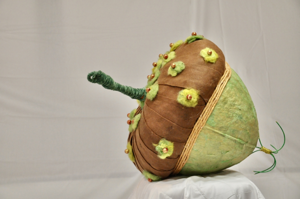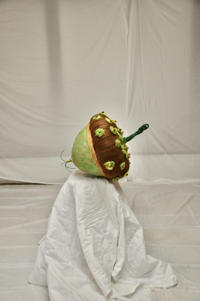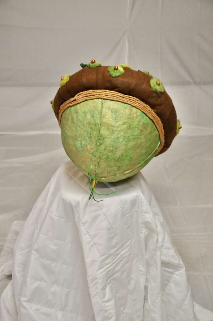 "Acorn" sculpture made of paper mache, rice paper, felted wool, golden hemp and pearls. L: 83 cm, w: 48 cm.