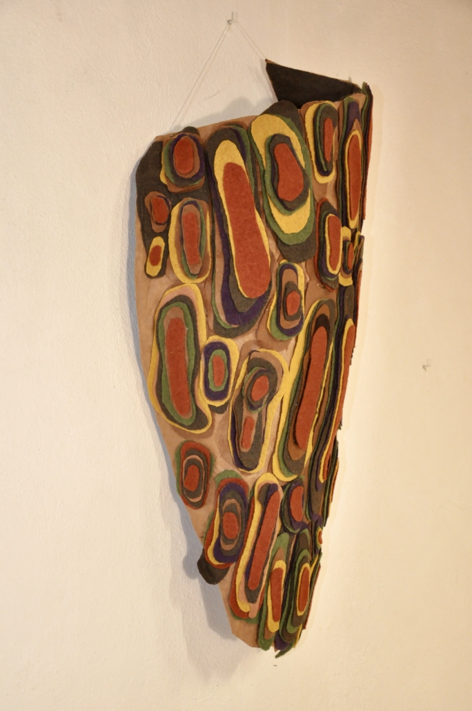 "Fun I" wet felted wool on silk. Free hanging artpiece back side. H. 100 cm, W. 30 cm.