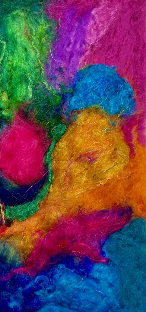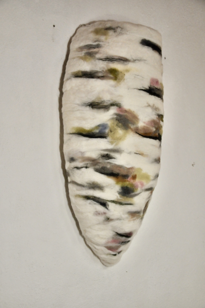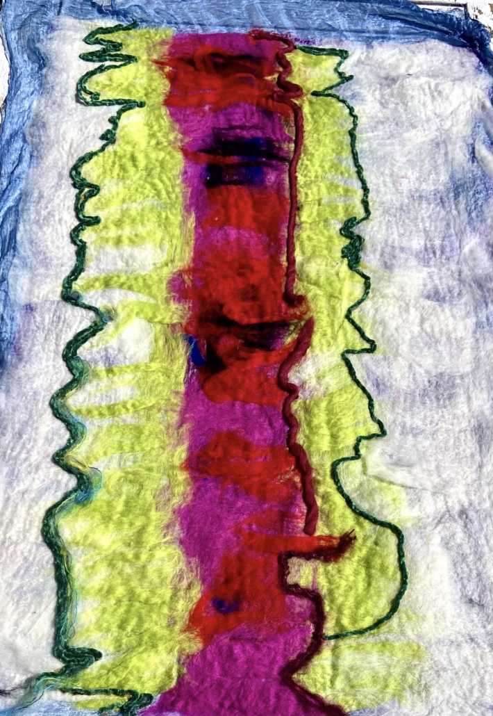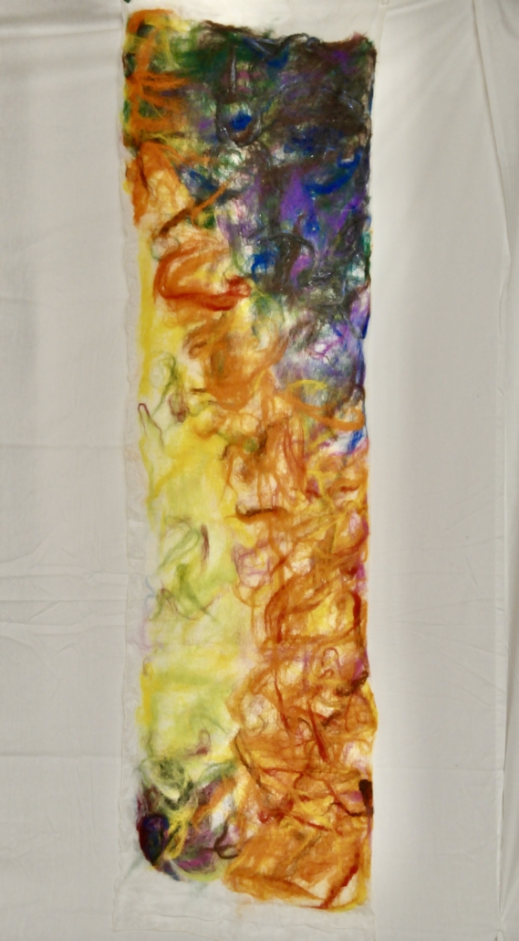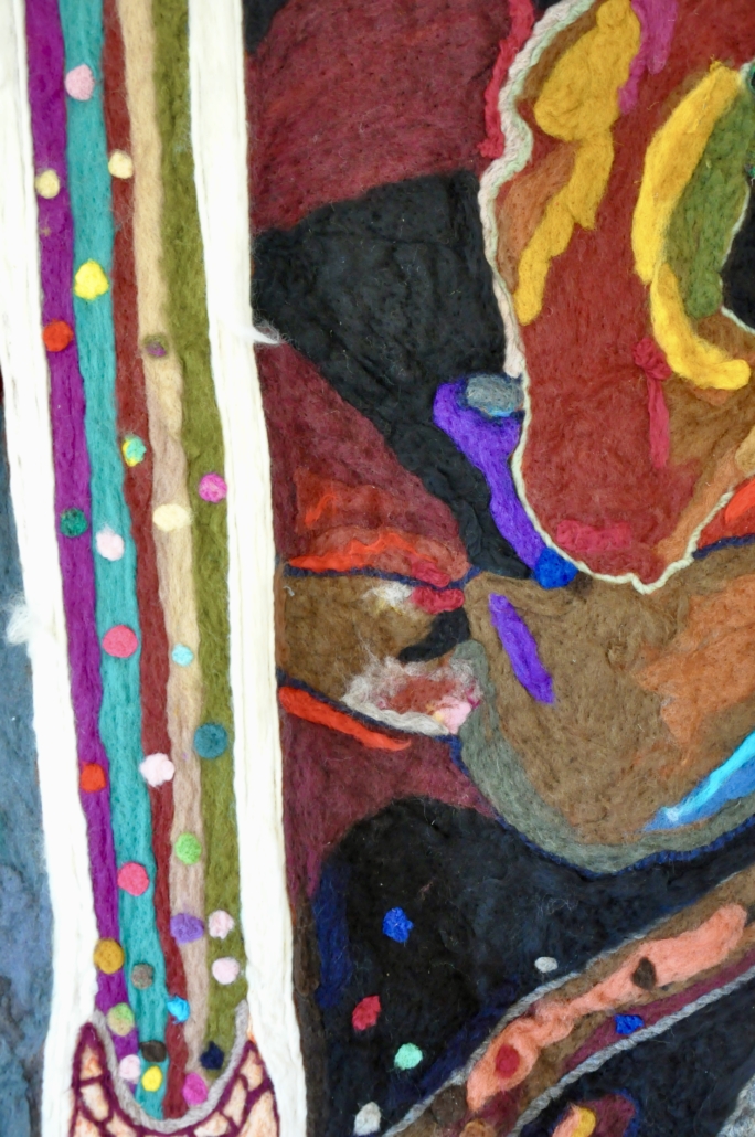 ”Voyage” wet felted merino wool on silk. Free hanging art piece side A: l: 155 cm w: 95 cm.