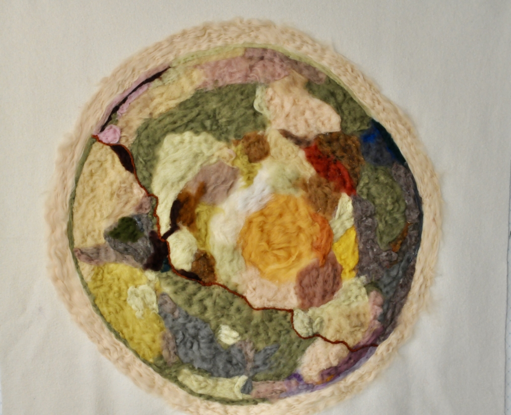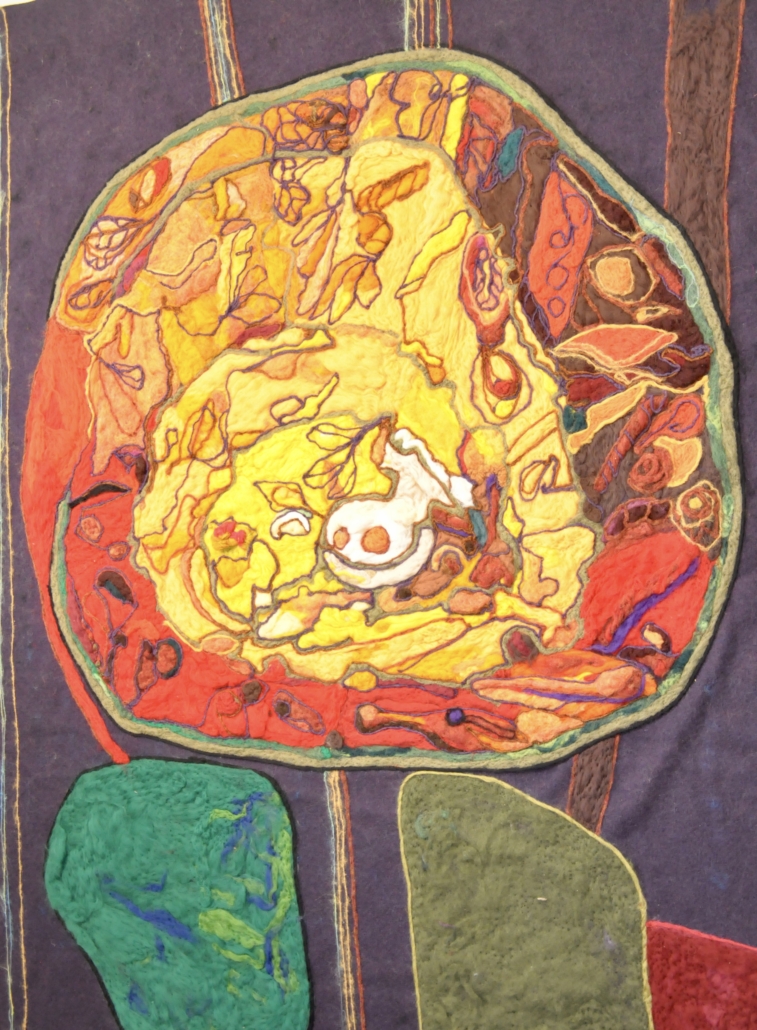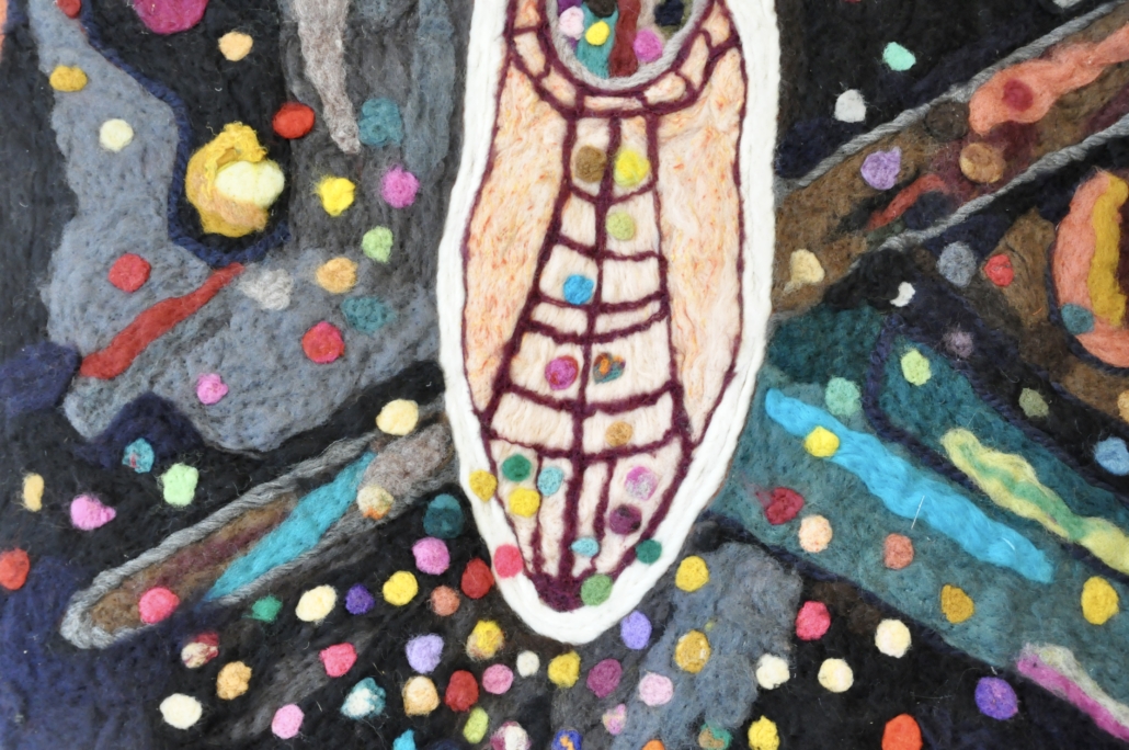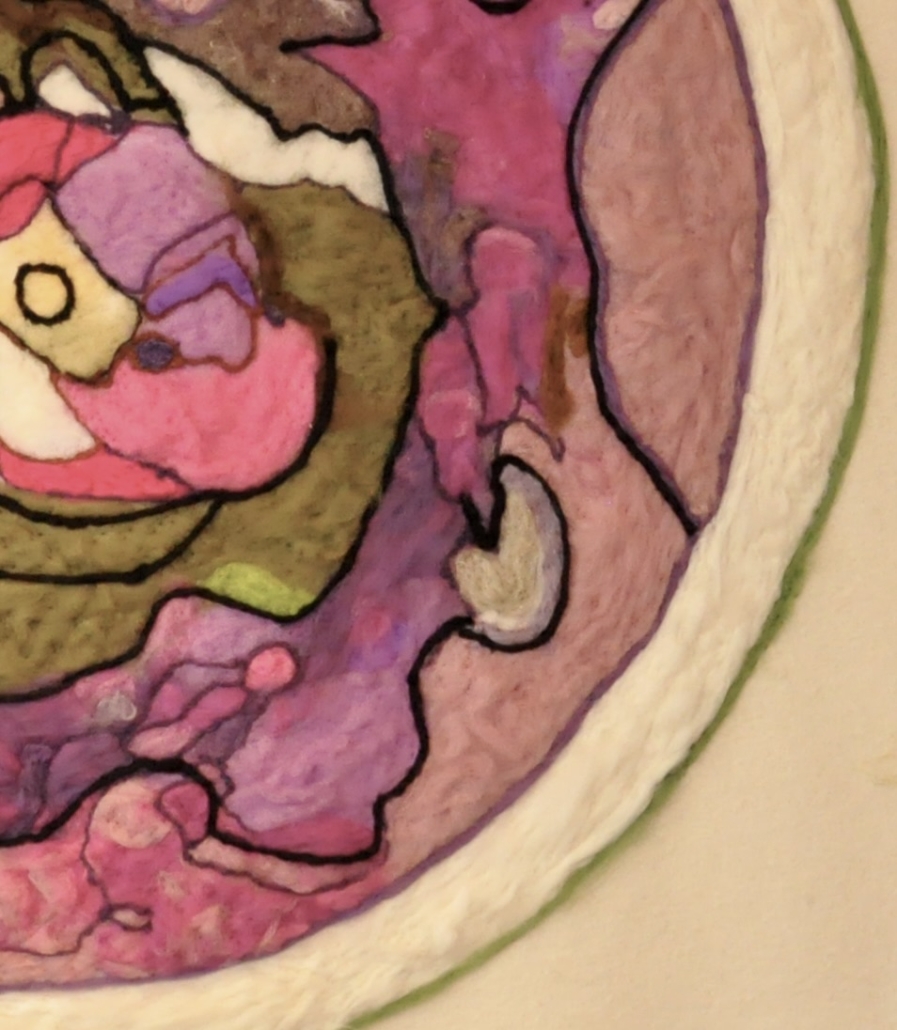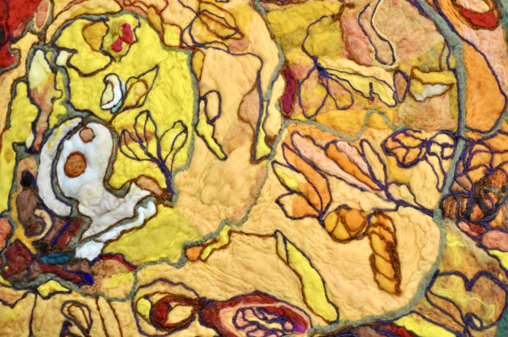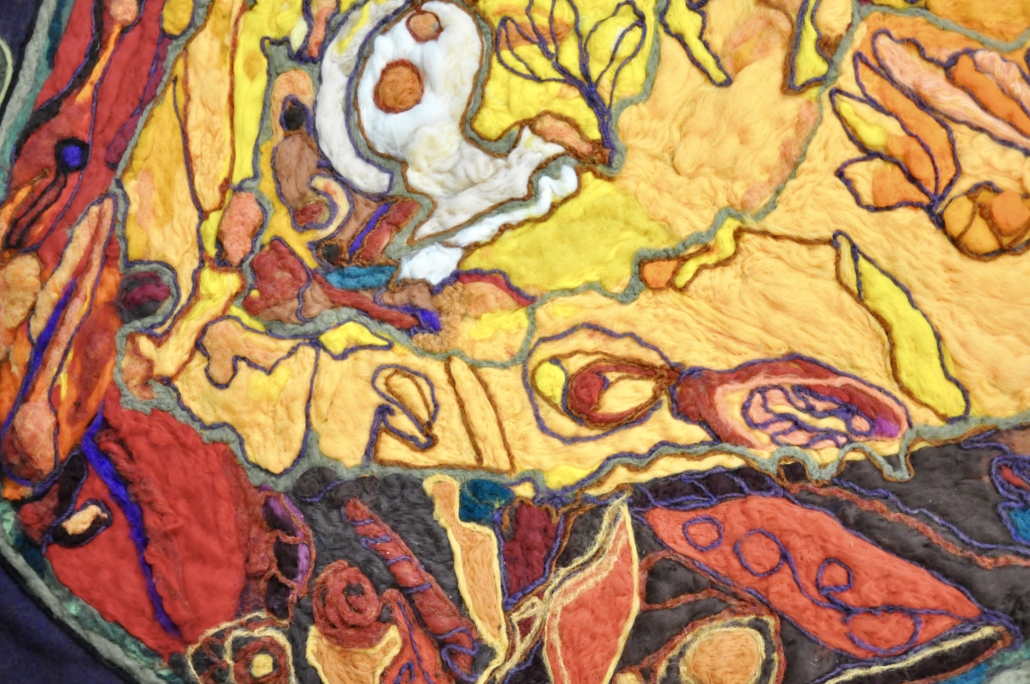 Cross section of a root. Needle felted lamb wool on wool fabric. H. 200 cm, w: 155 cm.