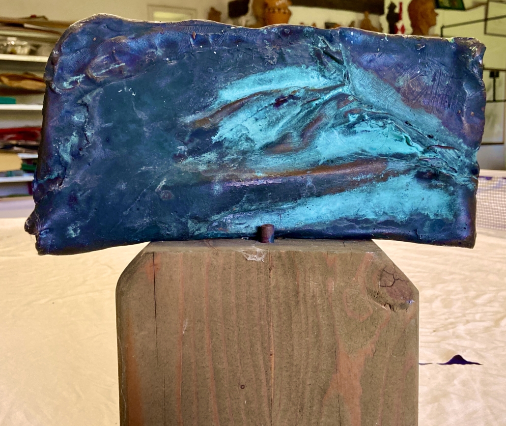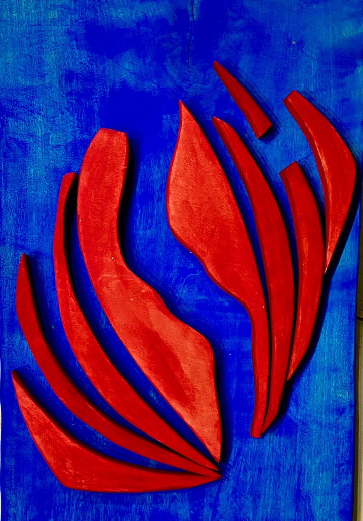 "Fire" wood with pigments. L. 45 cm, w. 33 cm, d: 3 cm.