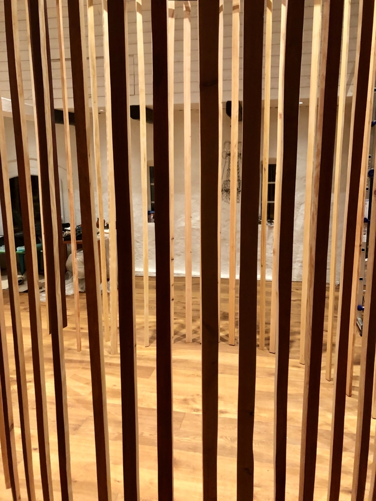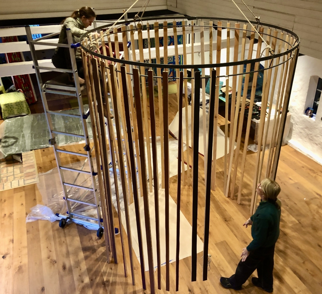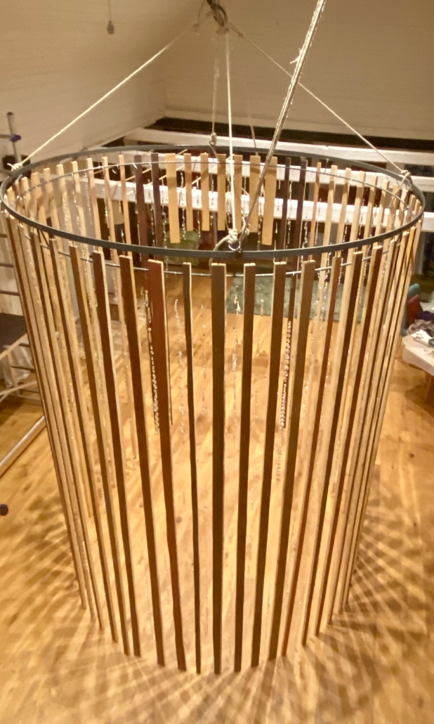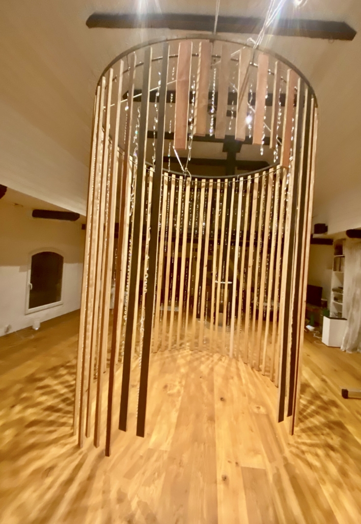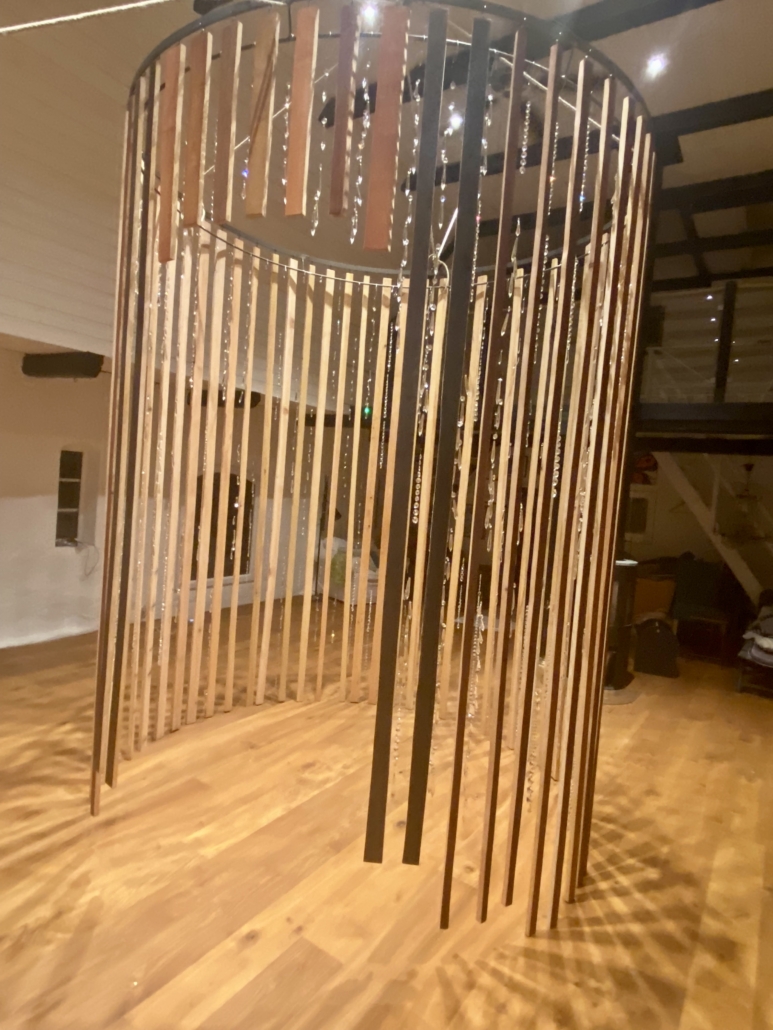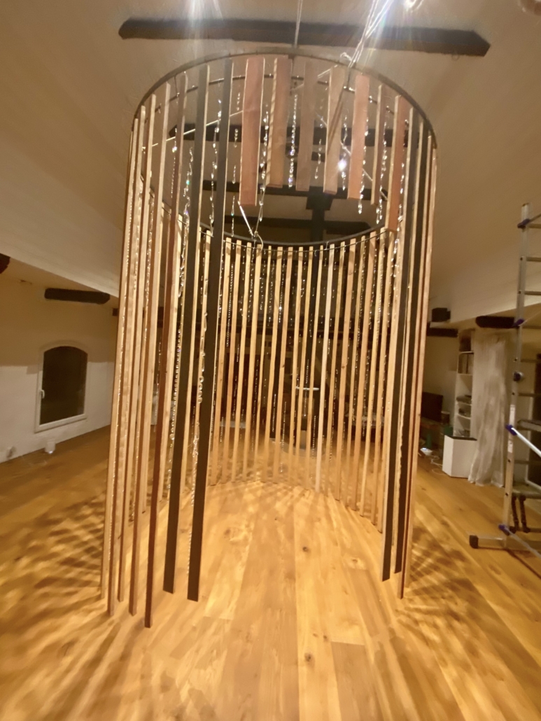 "Singing tree" hanging installation from beechwood with pigments and glass crystals on golden metal tread. H: 600 cm, w: 250 cm.