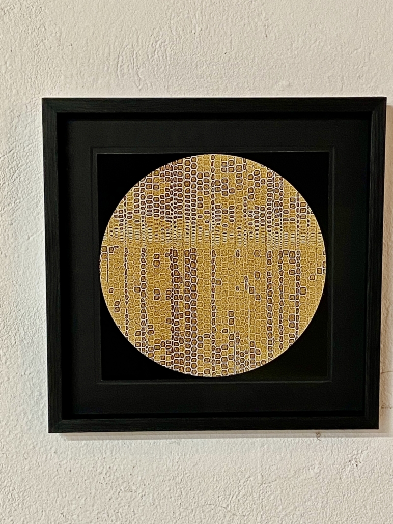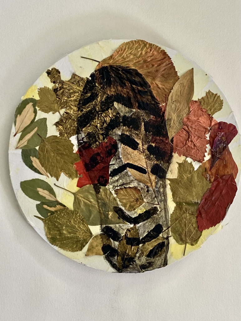 "Mankind" acryl on canvas with leaves and leaf skeleton. Diameter: 25 cm.
