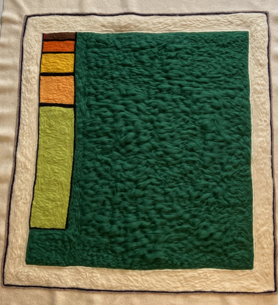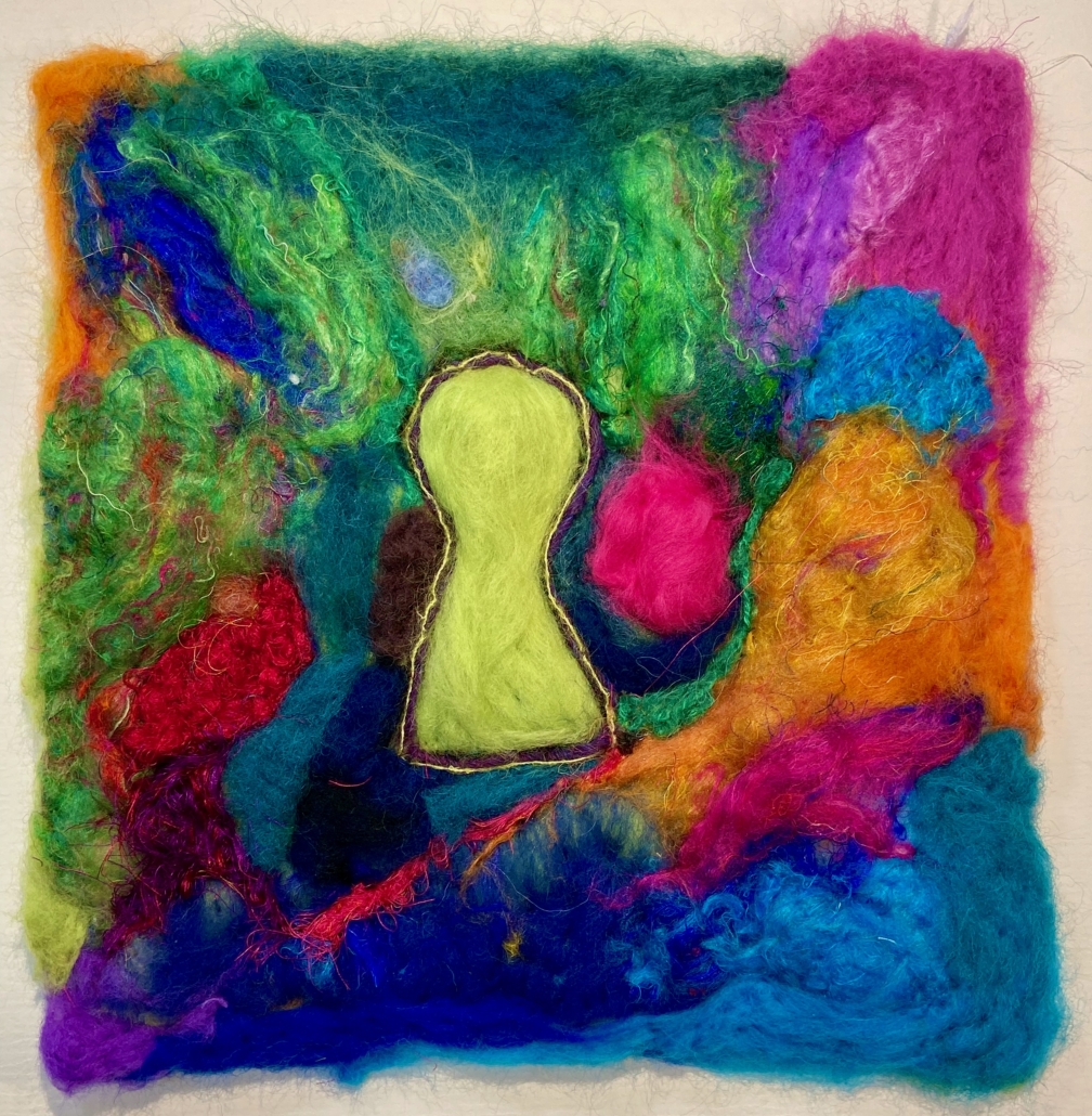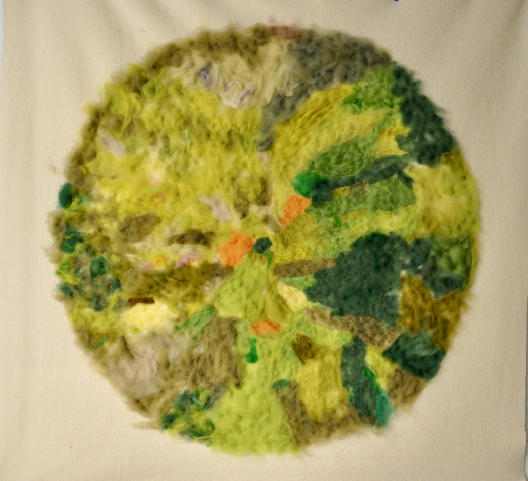 "Through the green threshold". Dry felted wool and wet felted wool on wool fabric. L: 20 cm, w: 20 cm