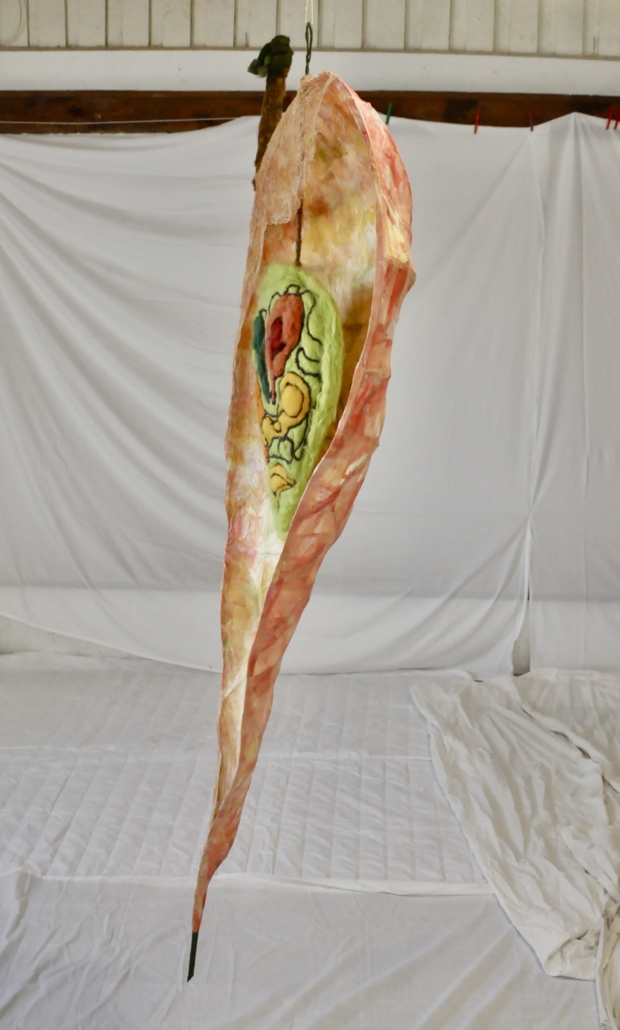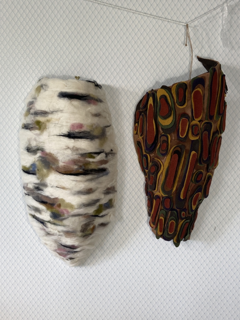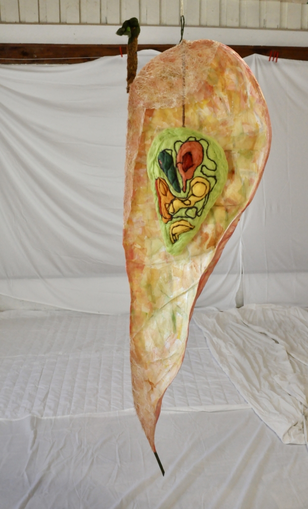 "Seed capsule". Free hanging sculpture collage paper on rattan, Felted wool and wool fabrics. H: 200 cm, w: 66 cm, d: 30 cm.