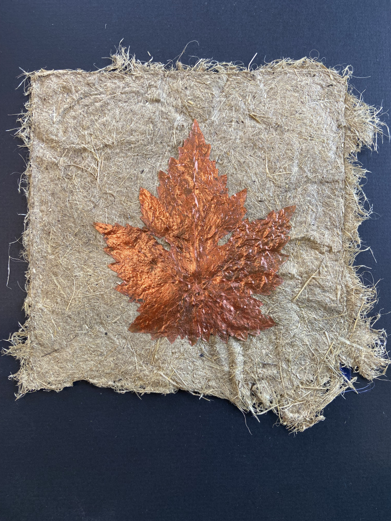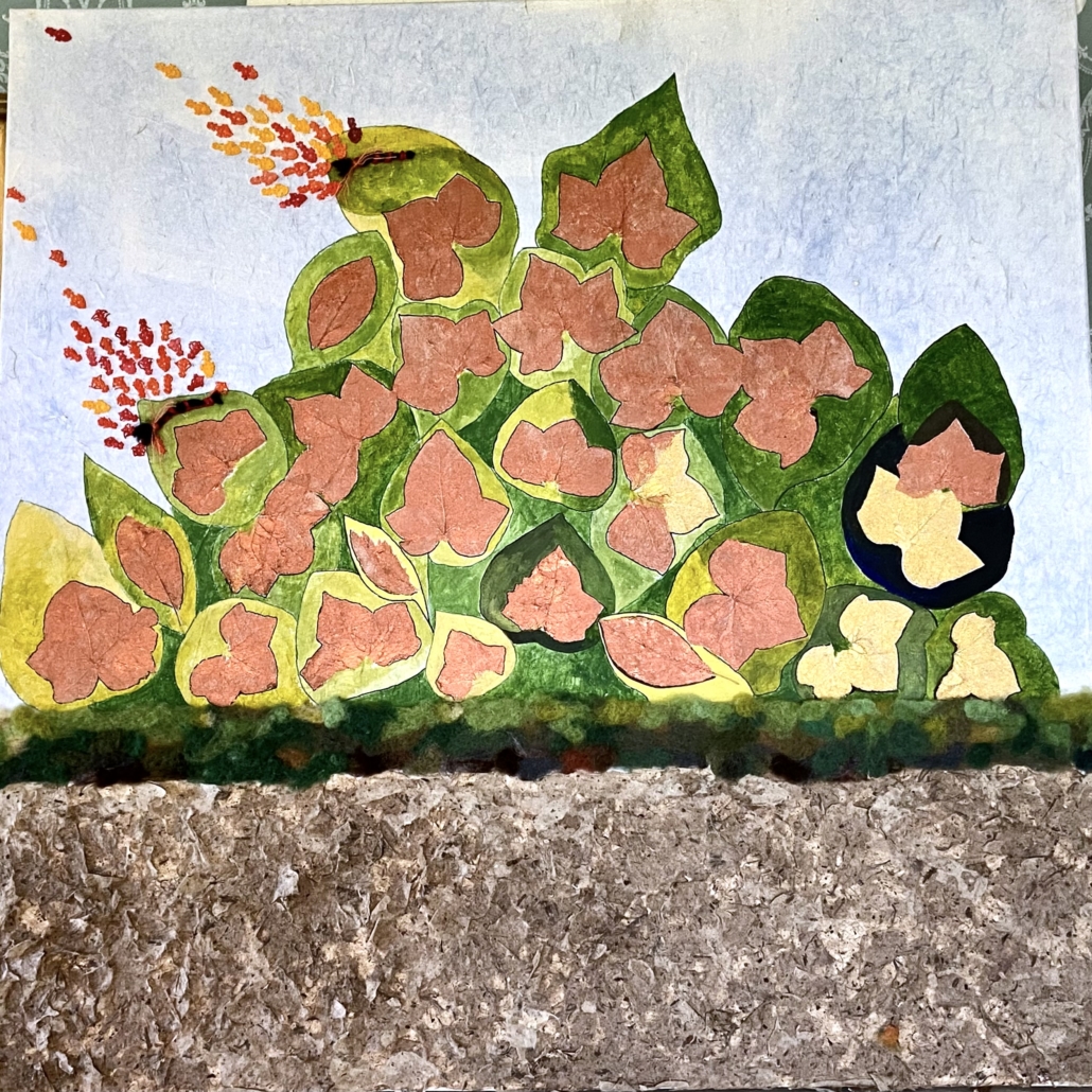 "Leaf burning" collage of paper of Mulberry tree, leaf sceleton, tufted wool. L: 100 cm, w: 100 cm.