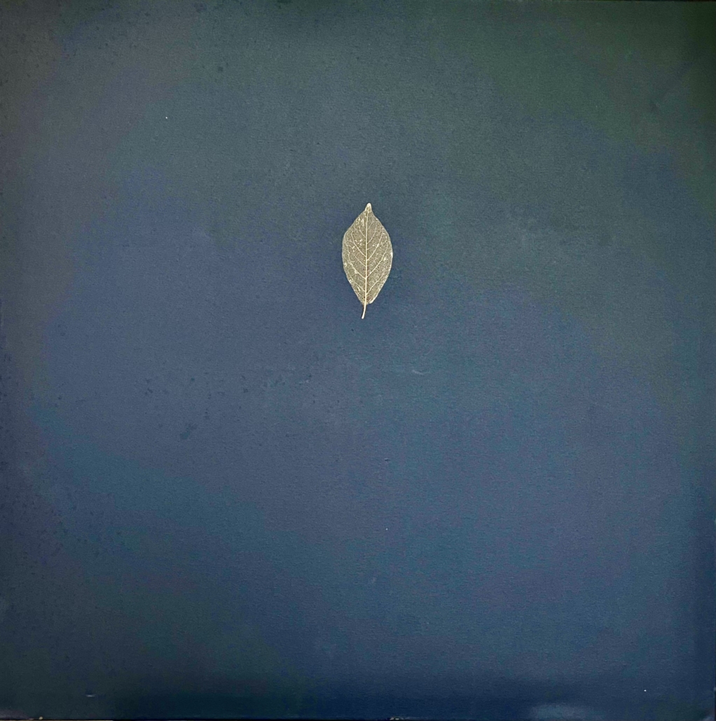 "Alone" leaf sceleton fiber on black canvas. L: 100 cm, w: 100 cm.