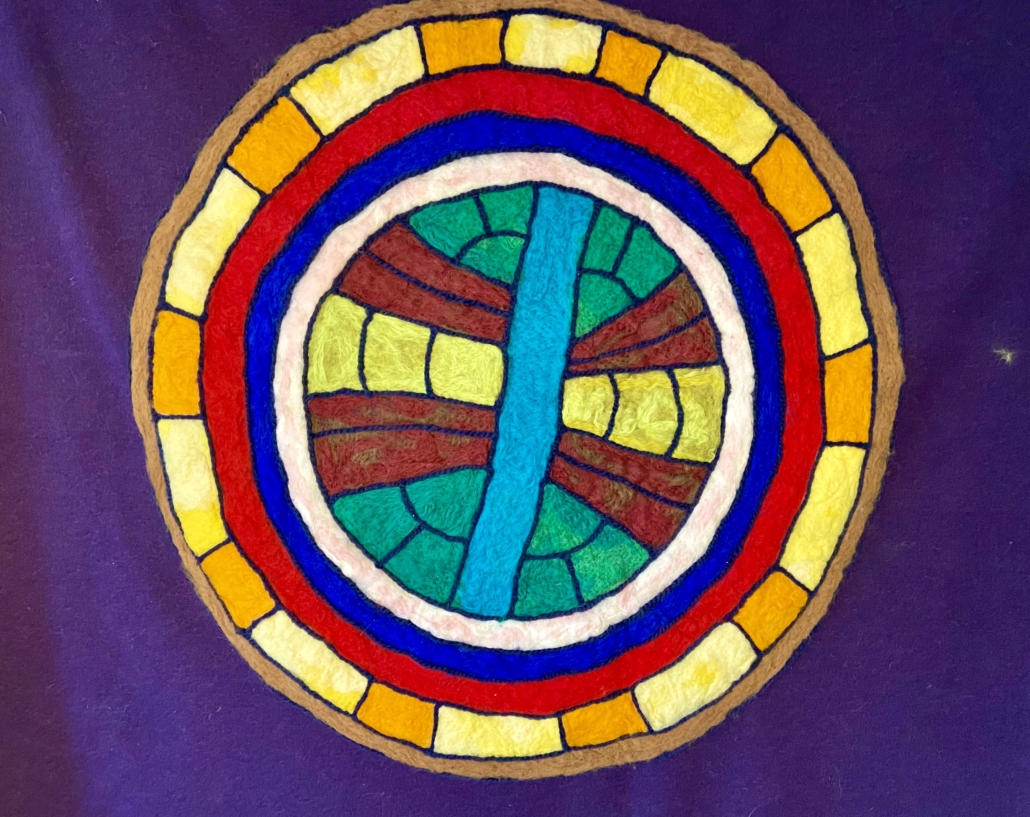 "forest circle". Dry felted wool on wool fabric. L: 140 cm x W. 140 cm.