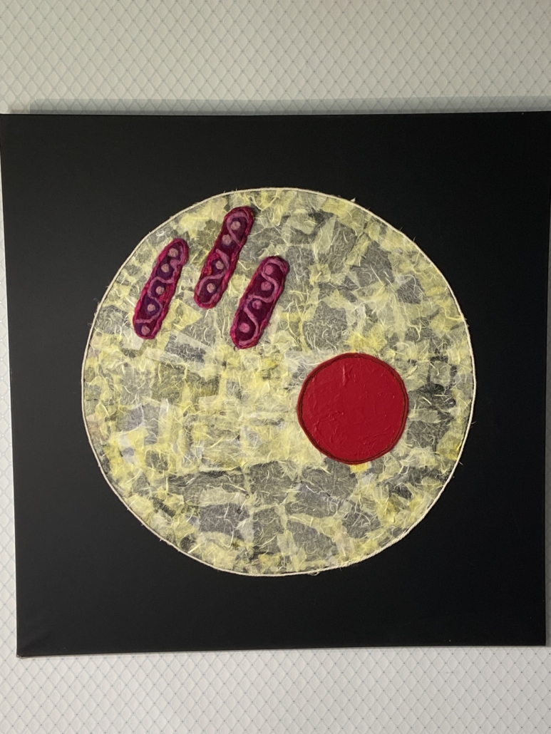 "Animal cell" acrylic, rice paper and filted wool on canvas. L: 100 cm, w: 100 cm.