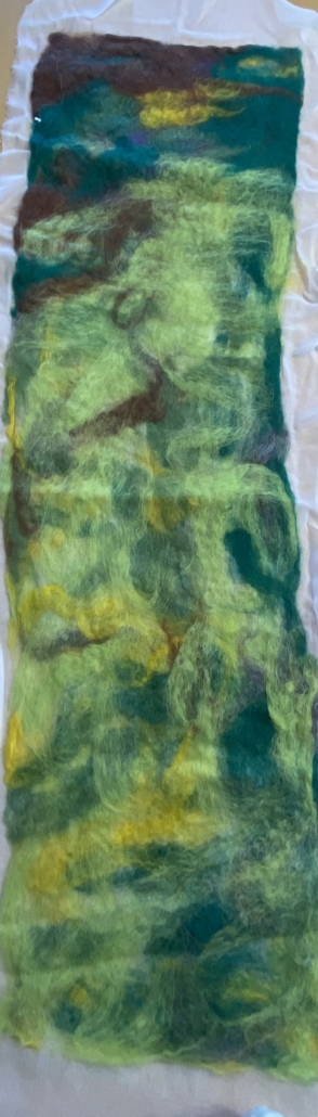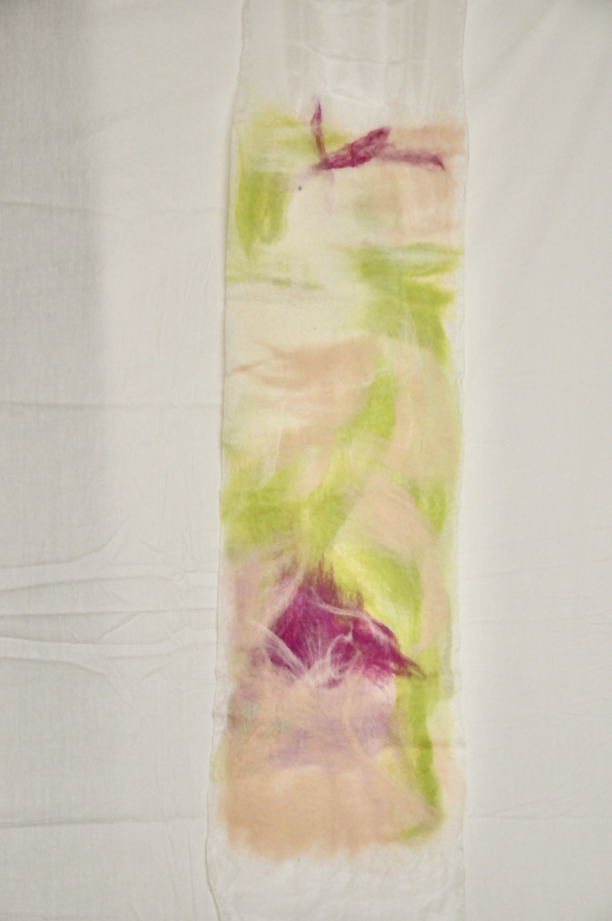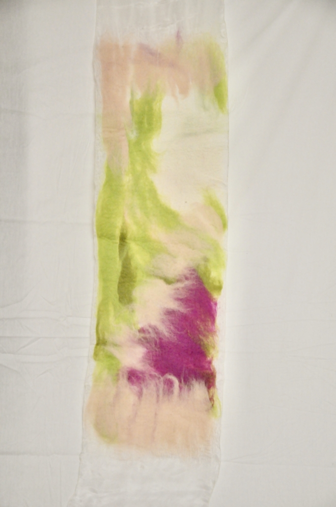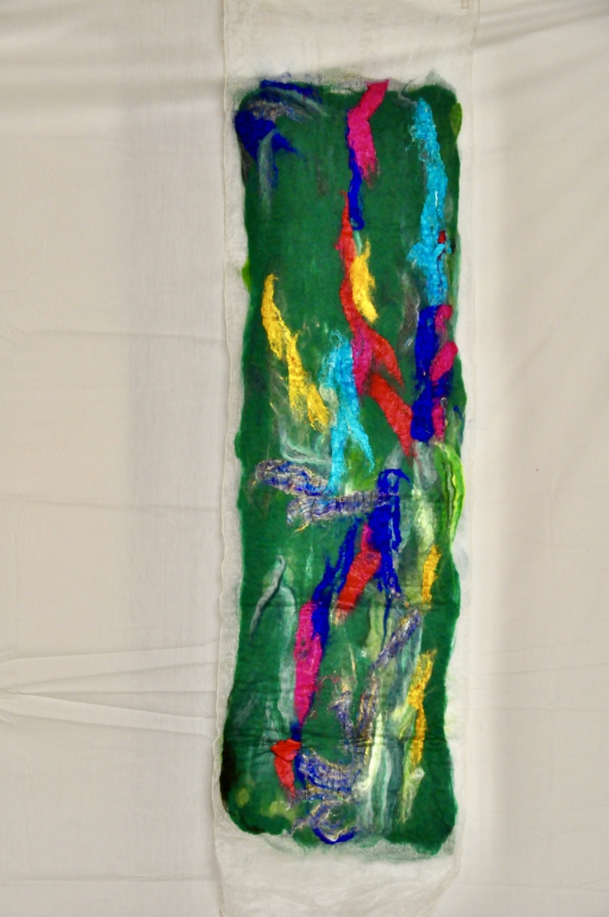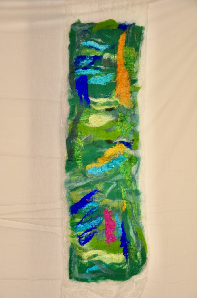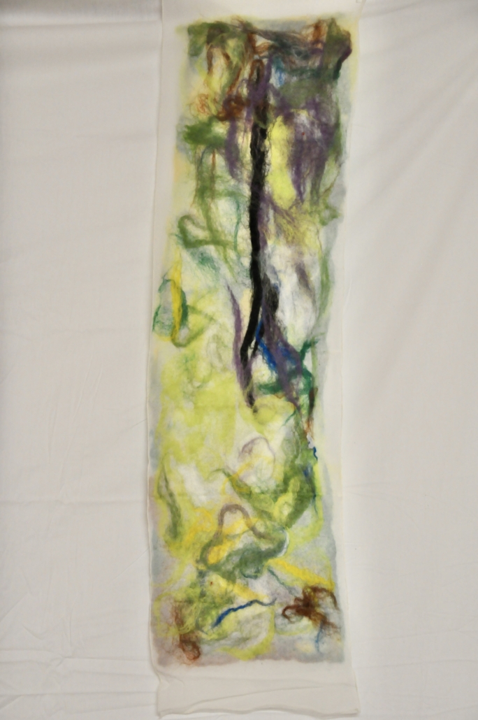 "Grenwork I" wet felted wool on silk. L: 100 cm, ,w.28 cm.