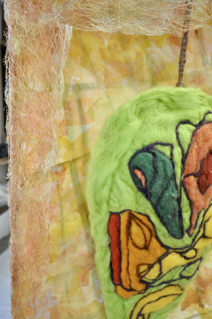 Detail "Seed capsule". Free hanging sculpture collage: paper on rattan, Felted wool and wool fabrics. H: 200 cm, w: 66 cm, d: 30 cm.