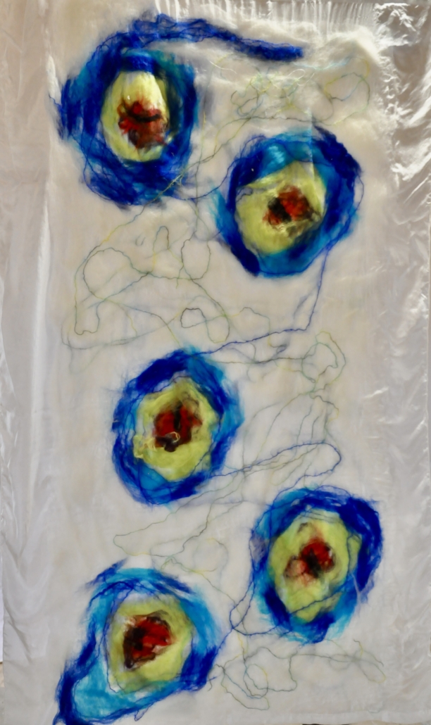 "Entangled cells" hanging wet felted wool on silk. L: 158 cm, w: 78 cm.