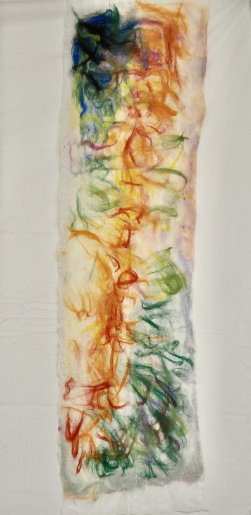 "Fun I" wet felted wool on silk. Free hanging artpiece front side. H. 100 cm, W. 30 cm.